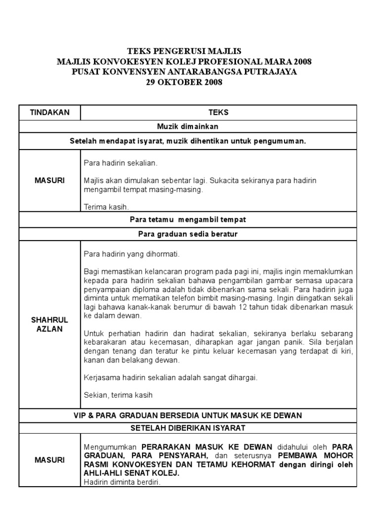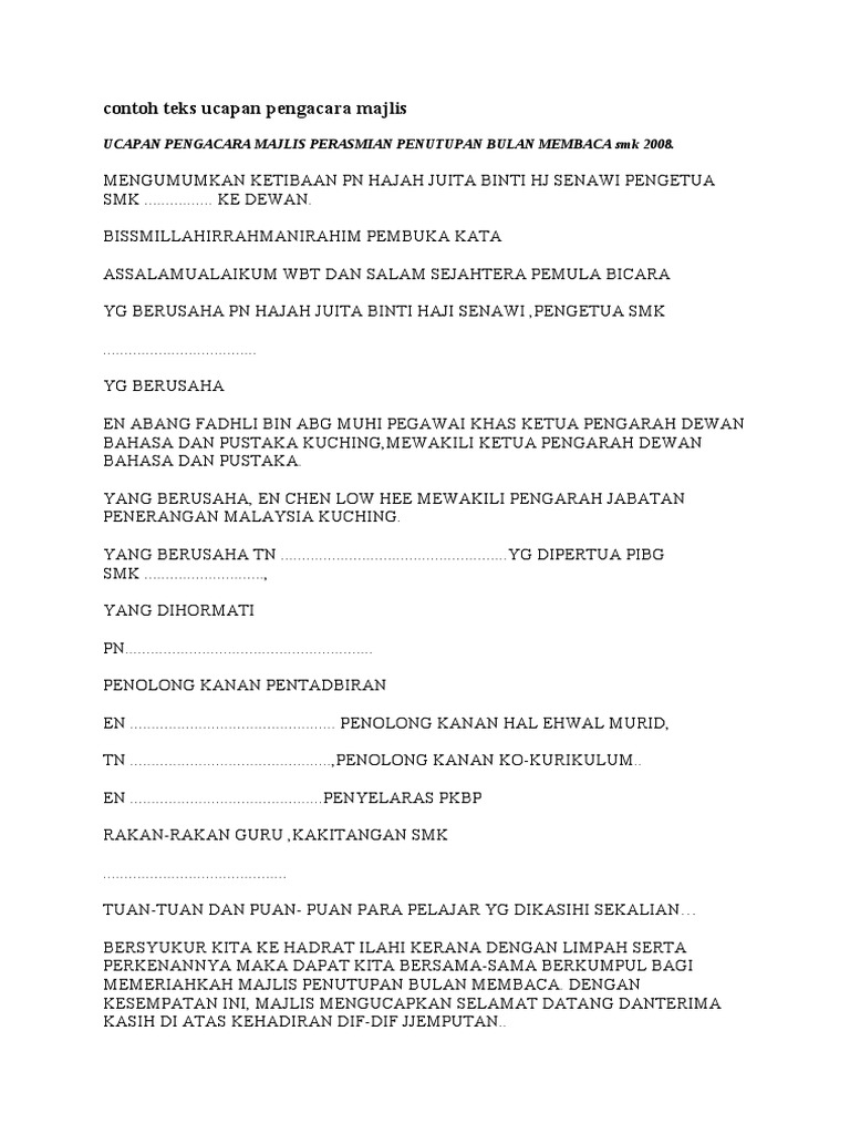 Contoh Teks Ucapan Pengacara Majlis - Doc Contoh Teks Ucapan Pengacara Majlis Sempena Jamuan Saadiah M Academia Edu / Pihak majlis serta seluruh warga sk batang kali, turut sama merakamkan ucapan terima kasih yang tidak terhingga kepada seluruh hadirin dan hadirat khususnya kepada.. Contoh teks pengacaraan majlis formal. Dalam setiap acara tentu kita memerlukan seorang mc yang memiliki peran untuk mengatur jalanya suatu acara, seperti halnya dengan mc pernikahan. Dijemput en jasni bin sahid selaku ketua dan wakil pembantu makmal untuk menuyampaikan ucapan, dipersilakan. Majlis persaraan pegawai pendidikan merupakan sebahagian tatacara operasi piawai atau s.o.p. Pihak majlis serta seluruh warga sk batang kali, turut sama merakamkan ucapan terima kasih yang tidak terhingga kepada seluruh hadirin dan hadirat khususnya kepada.