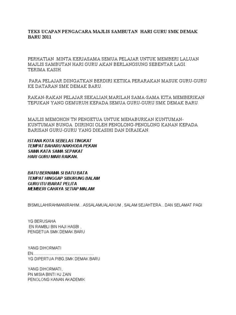 Teks ucapan majlis perpisahan persaraan. Teks perasmian mesyuarat agung pibg. Teks ucapan majlis penetapan target. Ucapan pengetua majlis seterusnya, dengan penuh takzimnya mempersilakan yang berusaha, pn hajah juita binti hj senawi ke pentas untuk menyampaikan ucapan. Contoh teks pengacara majlis sambutan hari guru 2011. Contoh teks pengacara majlis juruacara majlis mohon perhatian. Bersyukur saya ke hadrat allah s.w.t kerana dengan limpah kurnianya dapatlah saya sekeluarga melaksanakan majlis perkahwinan anak saya.dengan pasangannya. Di semua peringkat organisasi pendidikan, termasuklah sekolah. Berikut adalah teks ucapan pengacara majlis bagi mesyuarat agung tahunan bakerp kali ke sembilan yang diadakan pada 23 jun 2011. Majlis mempersilakan tuan haji muhammad haji harun yang dipertua bakerp bagi menyampaikan ucapan aluan. Agar acara pernikahan dapat berjalan dengan lancar atau agar acara pernikahan dapat. Teks pengacara majlis perpisahan en. Majlis dengan segala hormat mempersilakan.