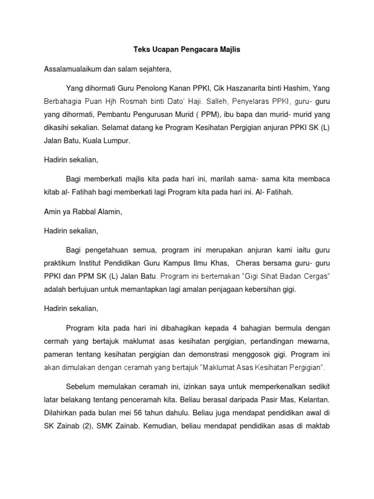 Raja dagang resort cherang ruku tok bali 12 november 2016. Juga sesuai diubahsuai untuk program sambutan lain dan juga peringkat daerah serta. Teks perasmian mesyuarat agung pibg. Pengacara majlis kesedaran alam sekitar. Ucapan pengetua majlis seterusnya, dengan penuh takzimnya mempersilakan yang berusaha, pn hajah juita binti hj senawi ke pentas untuk menyampaikan ucapan.
